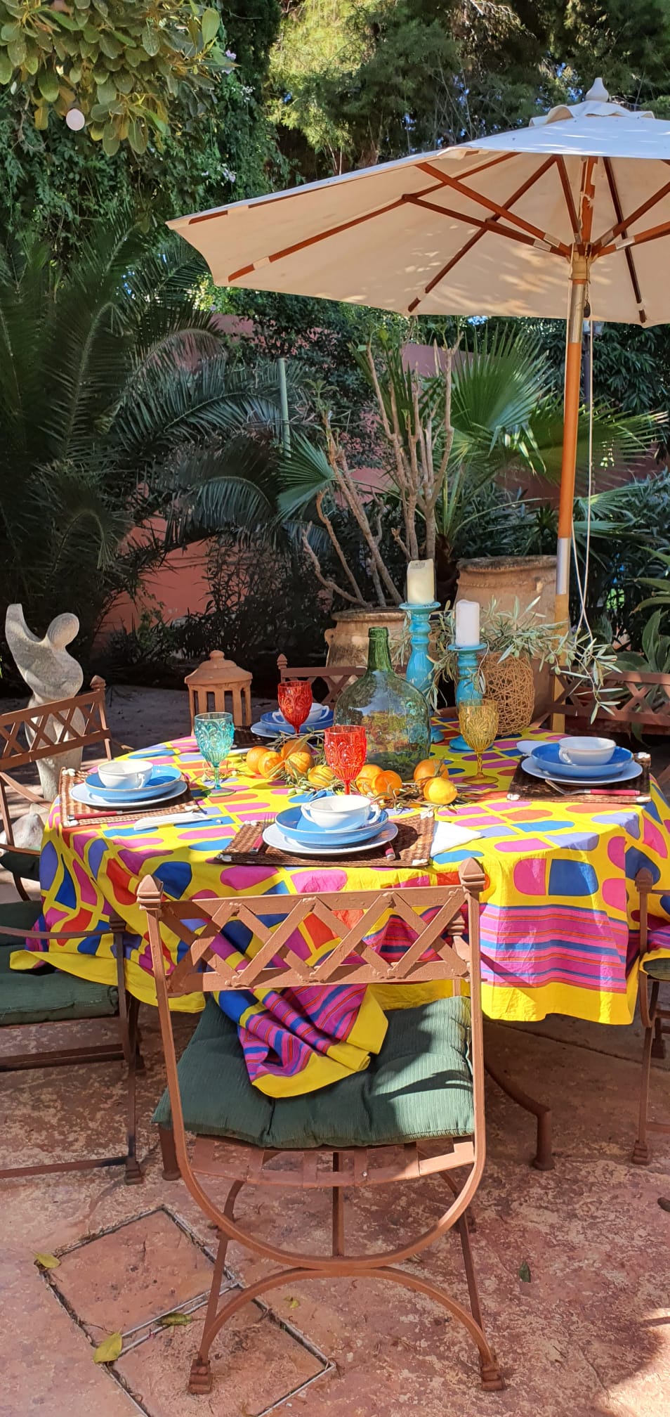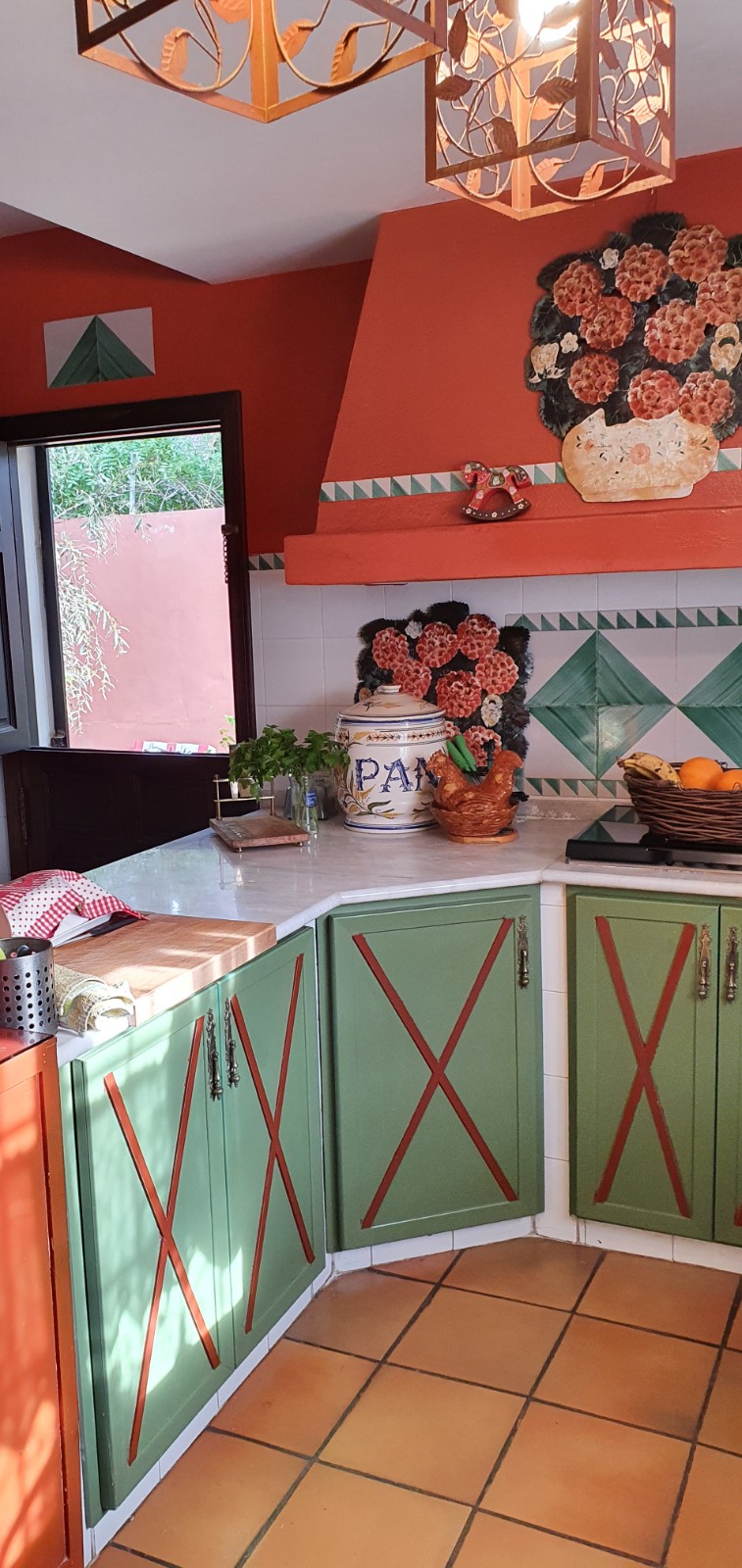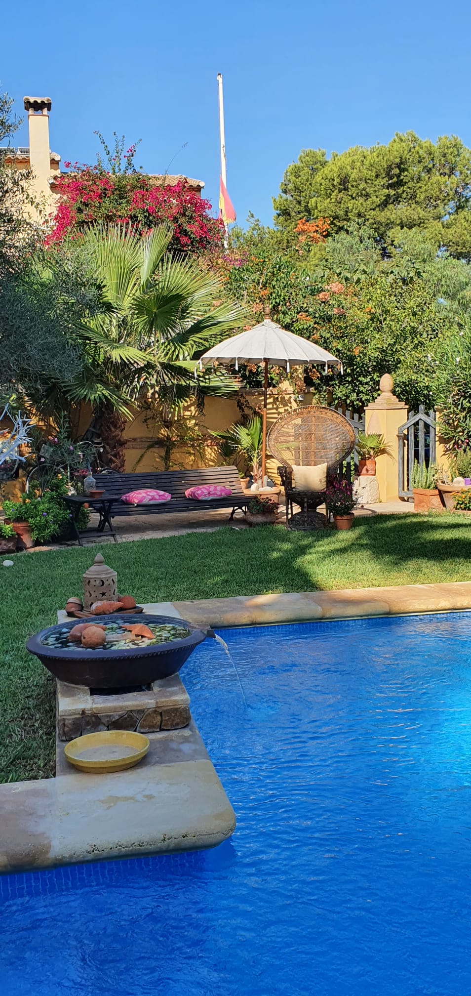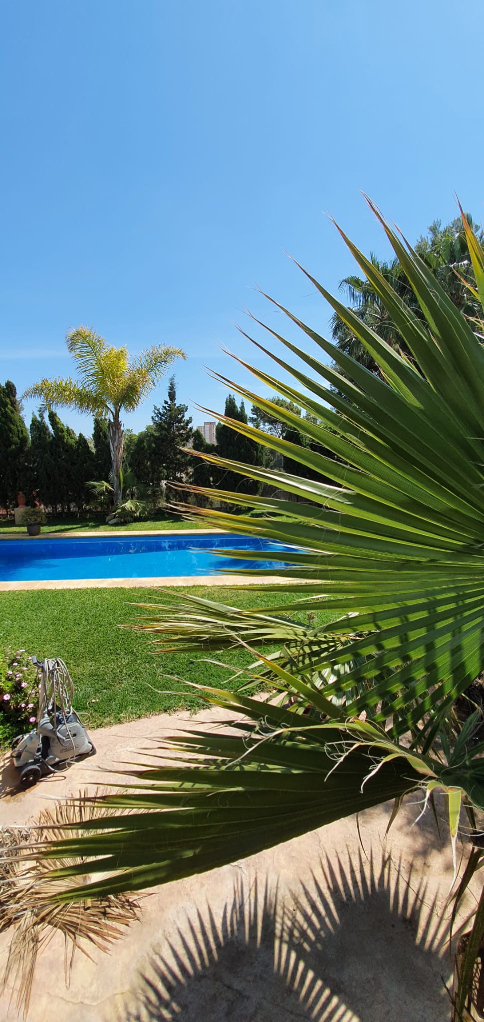 Con un jardín precioso, muy bien cuidado lleno de palmeras y todo tipo de árboles y plantas. Tiene una bonita y muy cuidada piscina junto a una zona de barbacoa techada y con preciosas bigas de madera, estilo muy mediterráneo.